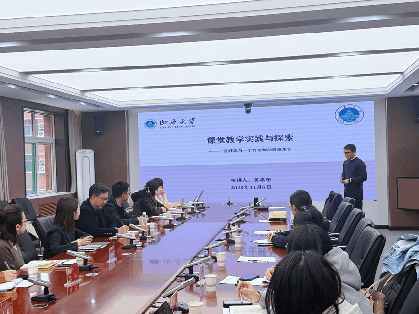 为进一步提升学院教师教学能力,11月6日下午15:00,我院特邀第六届全国高校青年教师教学竞赛一等奖获得者、山西大学黄孝东副教授来院作题为《课堂教学实践与探索——一堂好课与一个好老师的四重角色》的专题讲座。讲座由学院副院长单云慧主持,学院部分教师代表参会聆听学习、交流探讨。